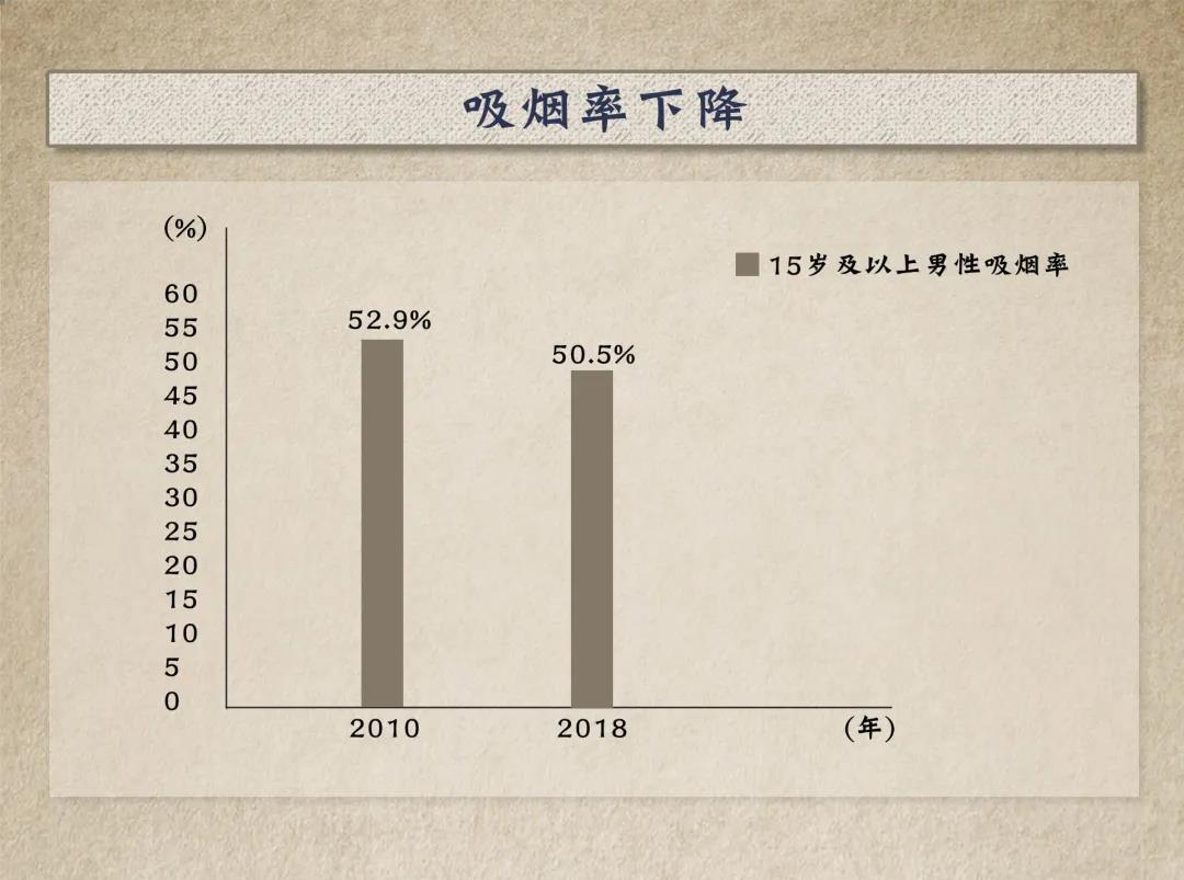 2010年至2018年,中國(guó)15歲及以上人群吸煙率呈下降趨勢(shì),其中男性從52.9%降至50.5%。2018年,86.0%的人認(rèn)為吸煙會(huì)引起嚴(yán)重疾病。