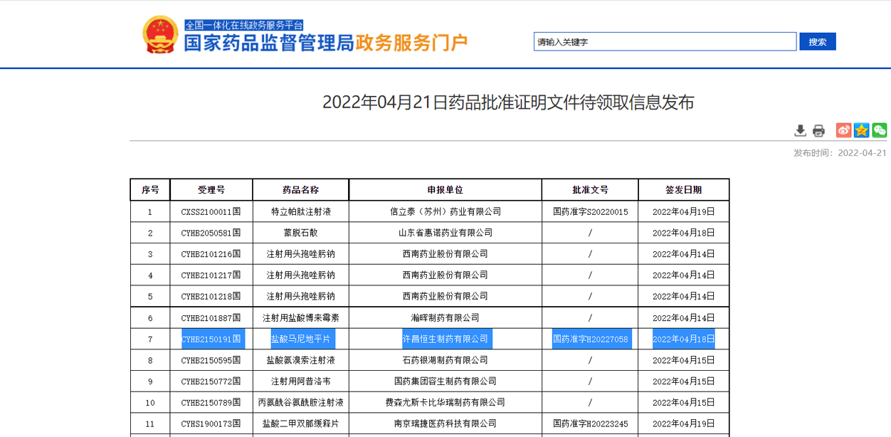 2022年04月21日獲得【NMPA政務(wù)服務(wù)】通知,受理號為CYHB2150191國的我公司產(chǎn)品鹽酸馬尼地平片獲批!