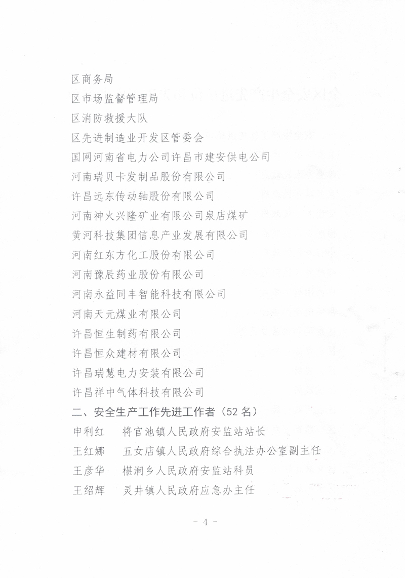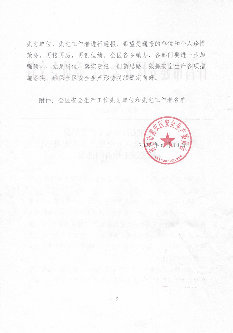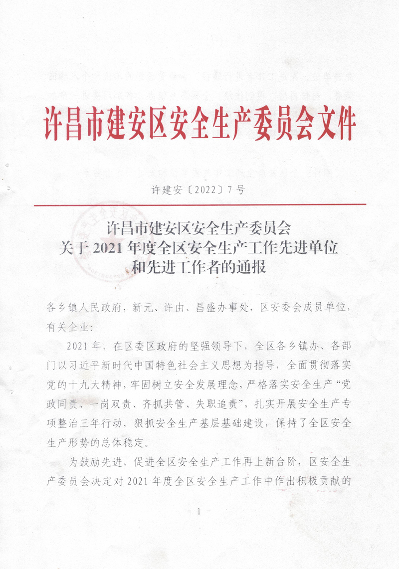 2021年,我公司以習(xí)近平新時代中國特色社會主義思想為指導(dǎo),全面貫徹落實黨的十九大精神,牢固樹立安全發(fā)展理念,嚴(yán)格落實安全生產(chǎn)“黨政同責(zé)、一崗雙責(zé)、齊抓共管、失職追責(zé)”,狠抓安全生產(chǎn)基層基礎(chǔ)建設(shè),排除潛在的安全隱患,保持了廠區(qū)安全生產(chǎn)形勢的總體穩(wěn)定。故許昌市建安區(qū)安全生產(chǎn)委員會對我公司在2021年度安全生產(chǎn)工作中的積極貢獻進行了表彰,授予于“全區(qū)安全生產(chǎn)工作先進單位”稱號。